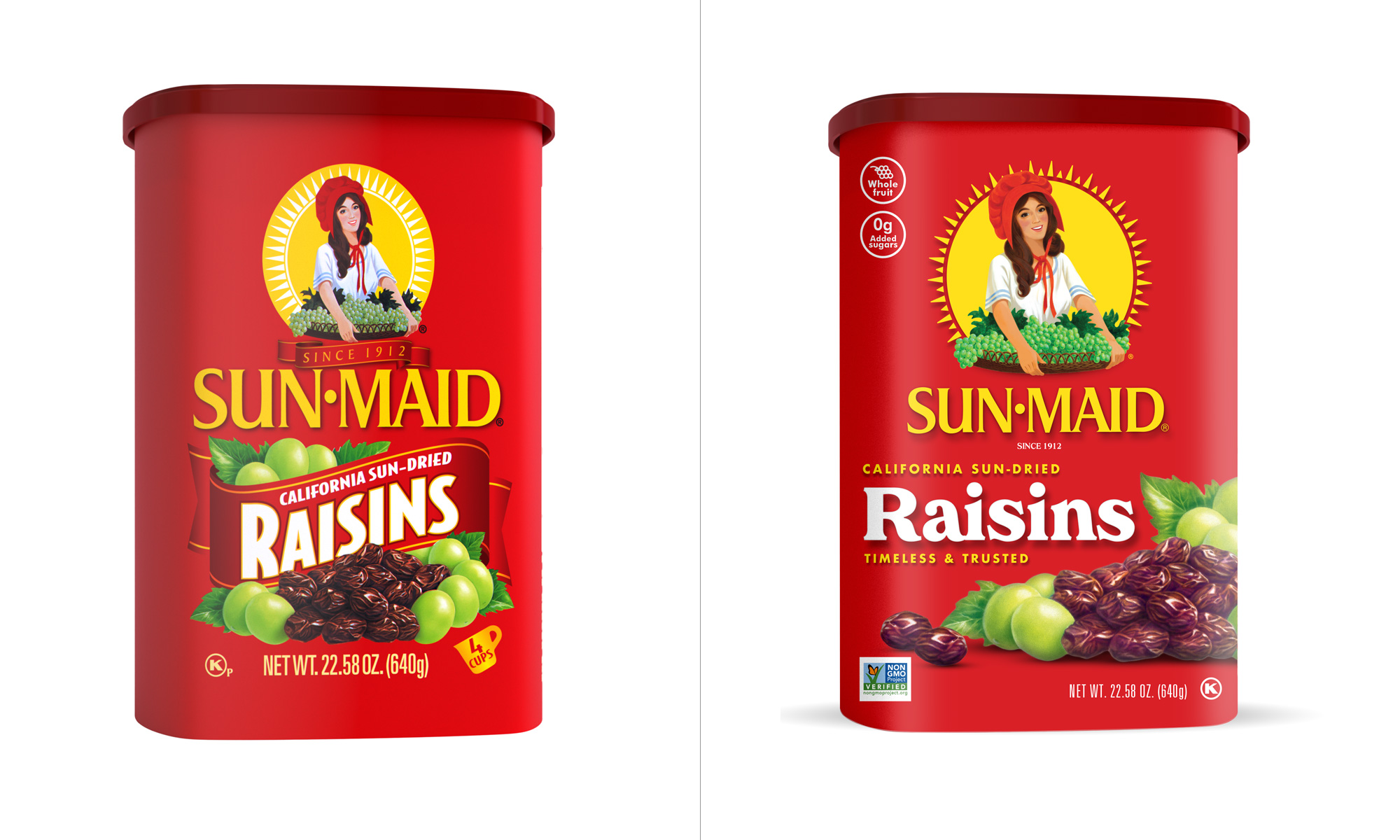 在2019年,Sun-Maid推出了十年来的首个广告,也是由淬火制作的,这促使人们考虑对其包装进行现代化改造。消费者的反馈帮助验证了是否有必要进行刷新,并表明对品牌的怀旧设计情有独钟,因此在进行更改以使其显得永恒的同时,保持其质量非常重要。保持标志性小红框的完整性是关键。该机构为Sun-Maid的女性吉祥物Lorraine (以真实人物命名)在包装上增加了更多的空间和深度,并使插图周围的阳光更加突出。结果图像弹出。新设计还指出了千禧代在食品中想要的关键产 品差异化,功能优势和食欲吸引力,例如“0克加糖",“全果制成"以及包装正面有影响力的非转基因项目验证。