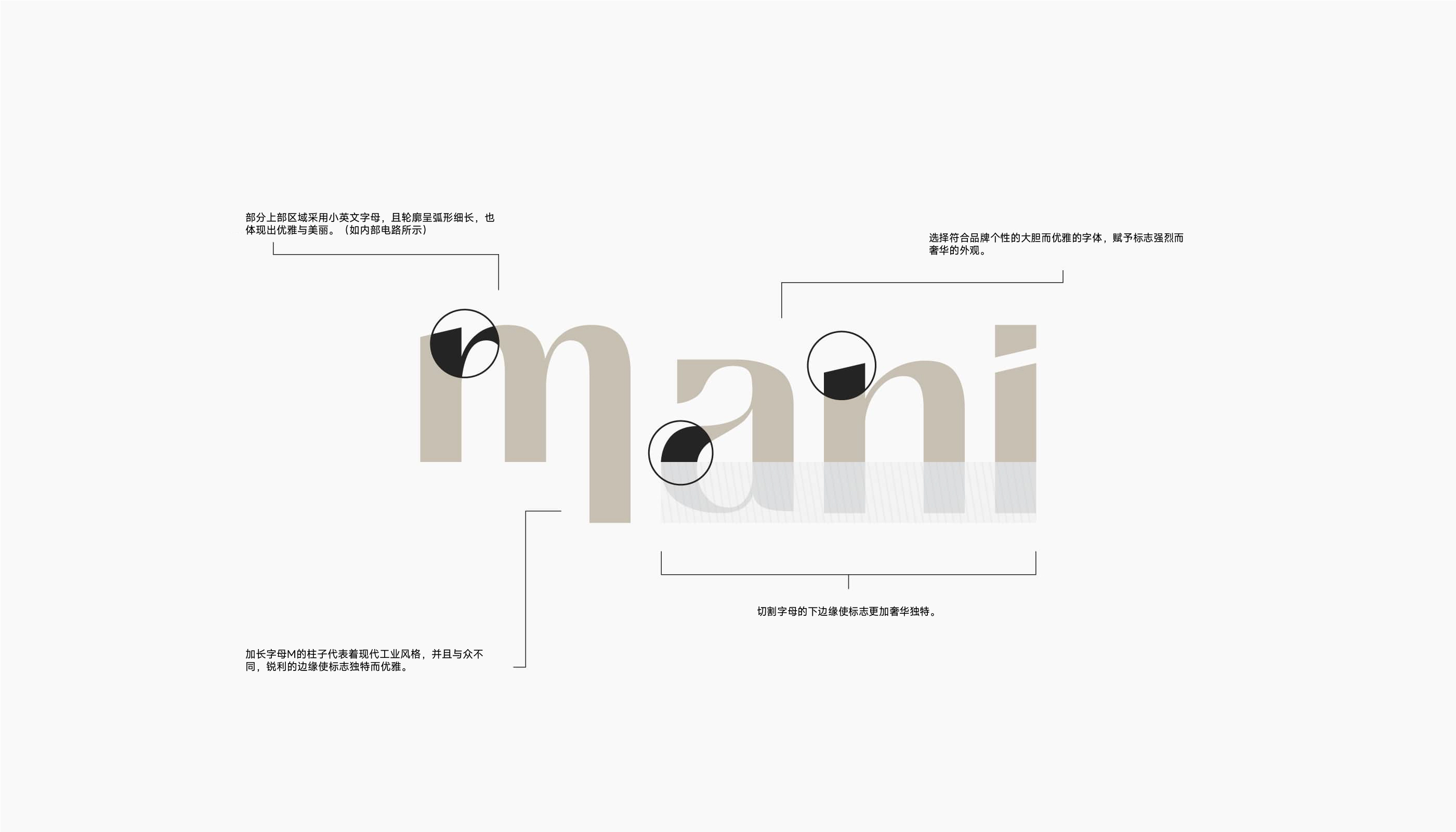 品牌识别系统是核心支撑:“mani”字标采用大胆优雅的定制字体,辅以精妙几何修饰,兼具精准逻辑与艺术灵动感,确保高辨识度与永恒美感;配色以自然原生色为基底,搭配柔缓中性色与点睛对比色,平衡质感与温度,告别高端品牌常见的冰冷感,传递“奢华即亲近”的主张。