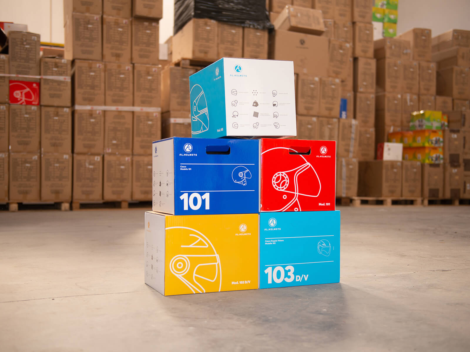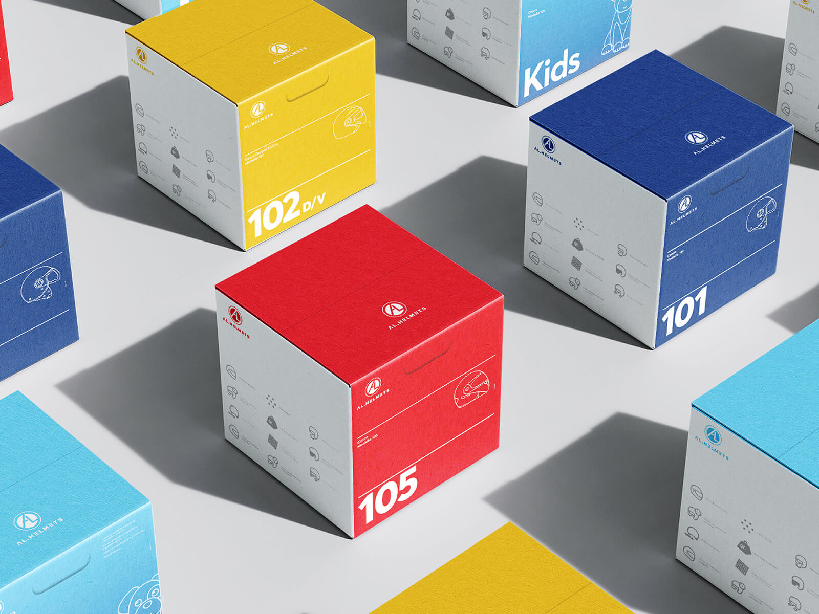 标志设计中我们创建了一套用于包装设计和目录的图标,并对公司销售的三种主要类型的摩托车头盔进行了样式化。色彩包装调色板除了底色外,我们还提供了一个调色板,可以用来区分包装,只有当用于特定包装时,才有可能降低品牌颜色。头盔包装设计:在过去的三年中,我们创造了许多不同的包装,每一个专门为特定的产品。对于摩托车头盔,目的是创造最小的,多种颜色的包装。零售商和大卖场通常为这些盒子奉献一整堵墙或架子,把它们放在一起,通常是几排。我们希望任何进入其中一家零售商的顾客立即被彩色盒子吸引。在出售带新盒子的头盔后的几个月里,我们得到了积极的销售反应,几乎增加了35%。