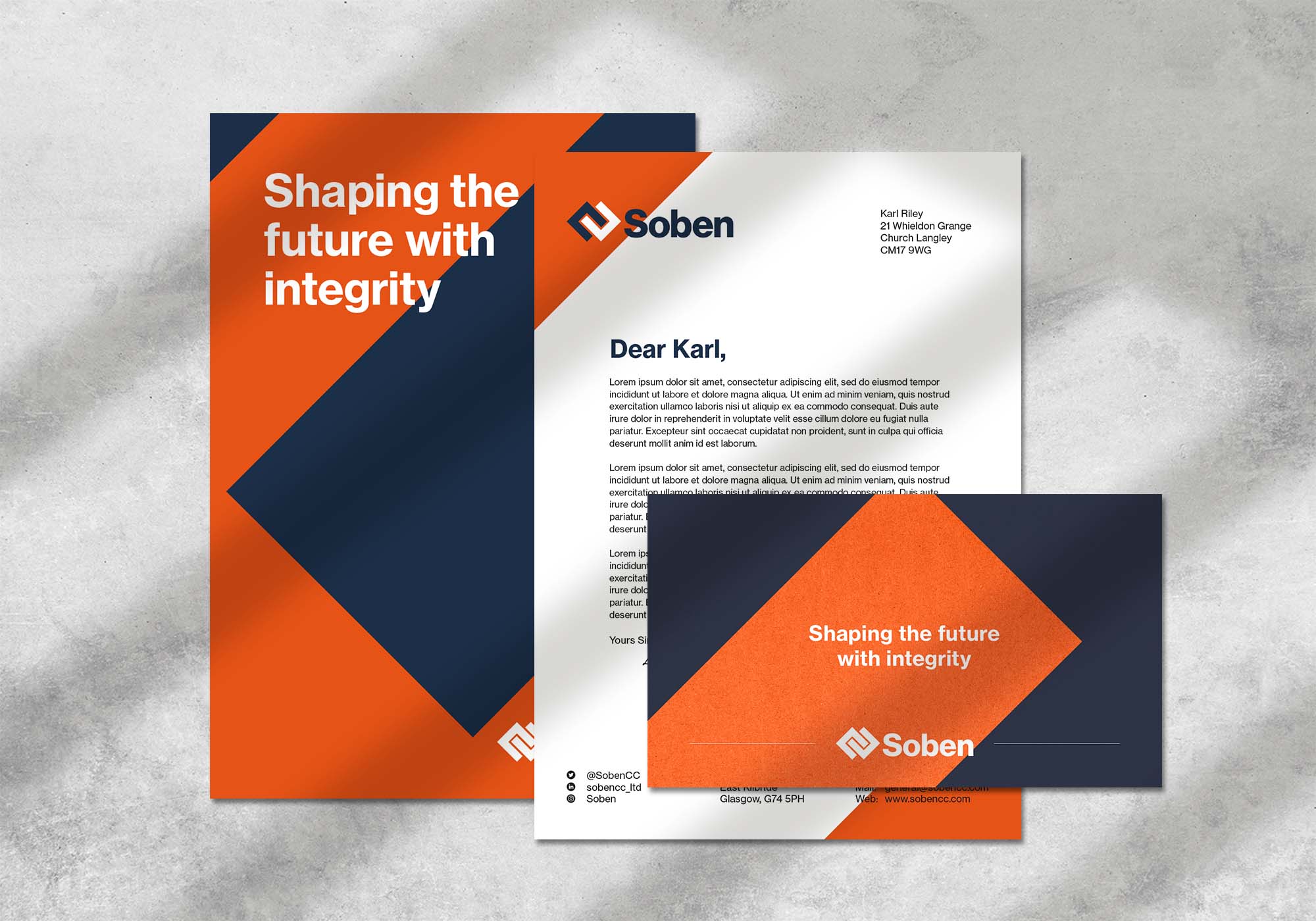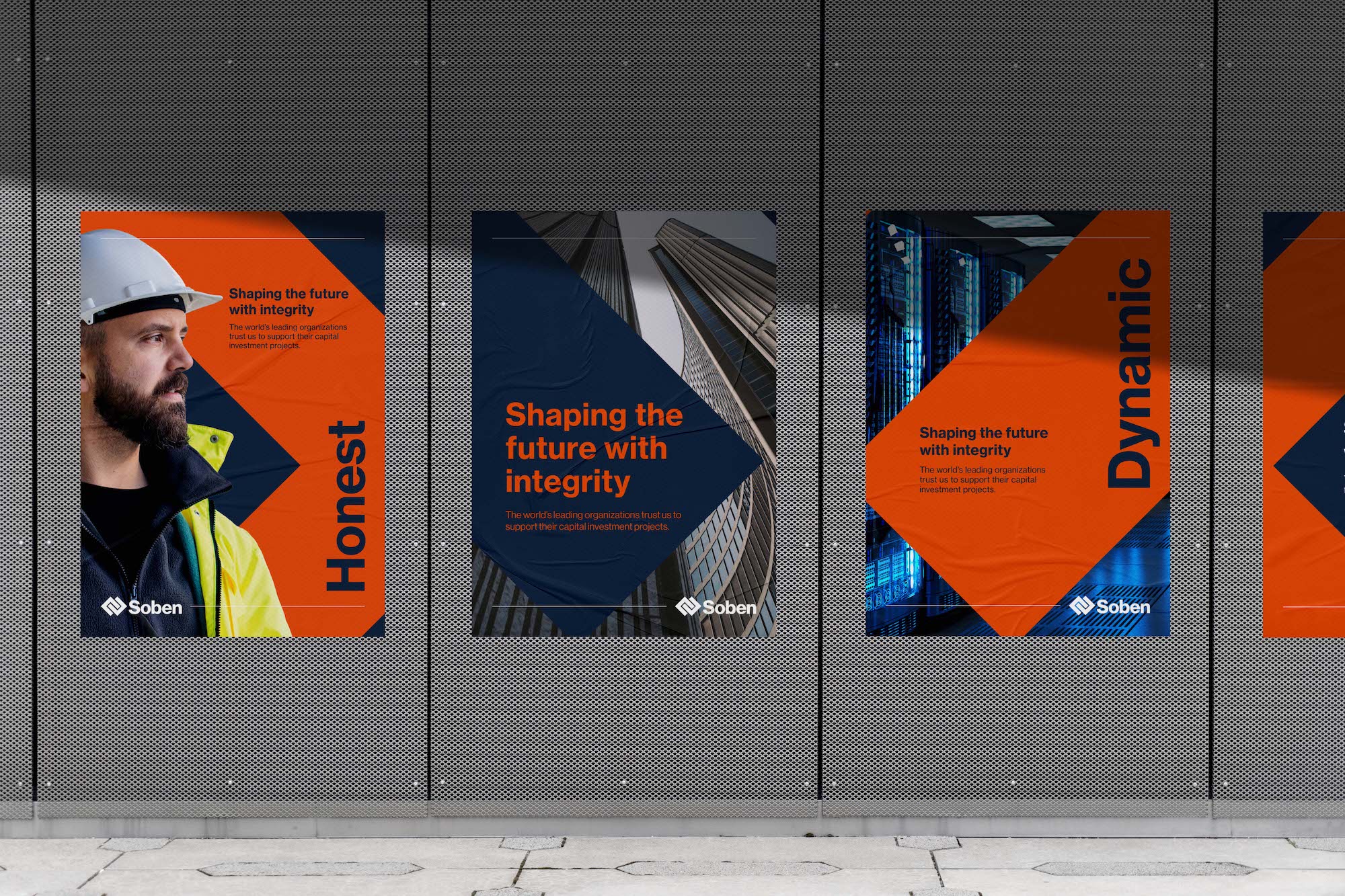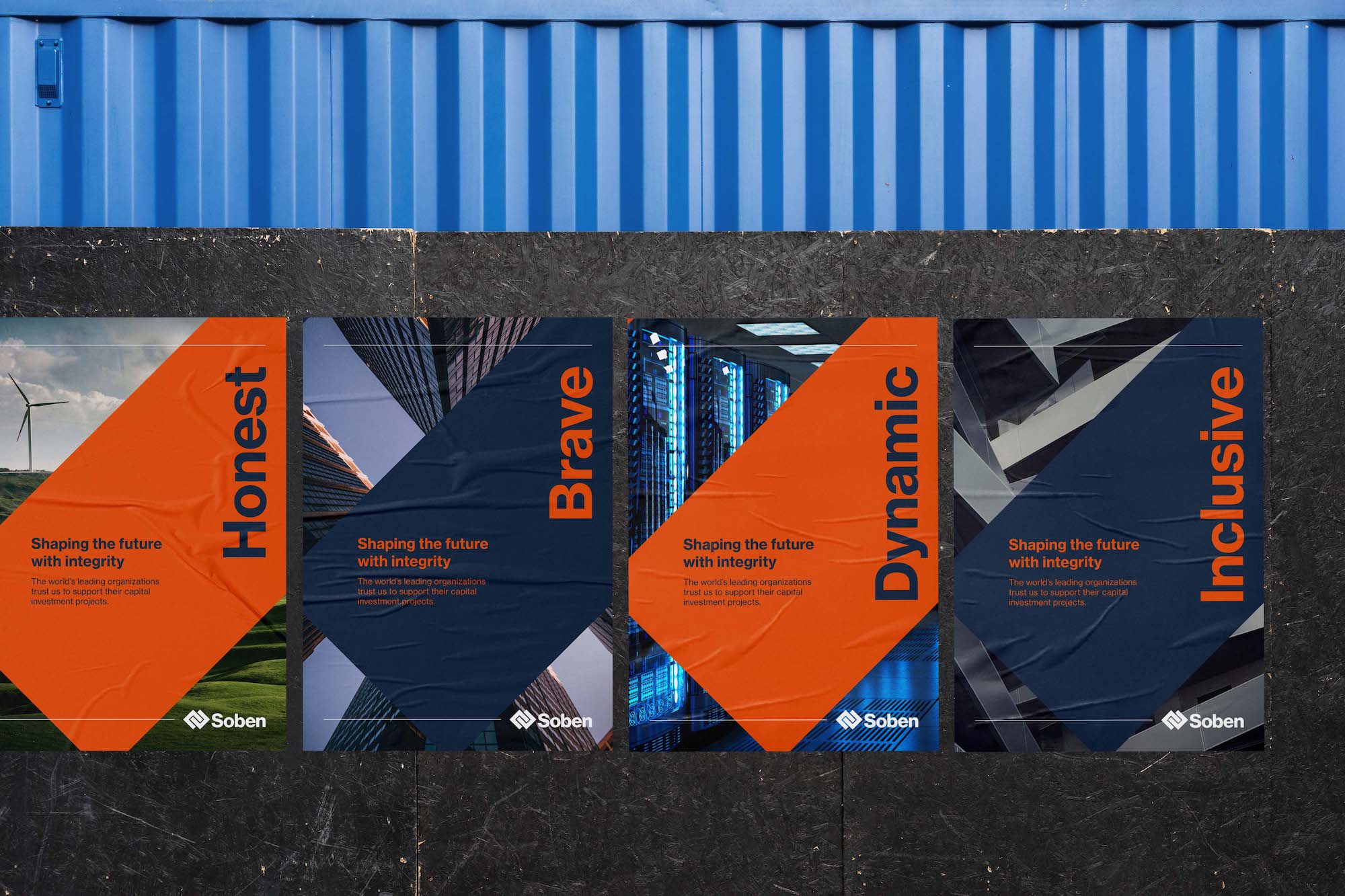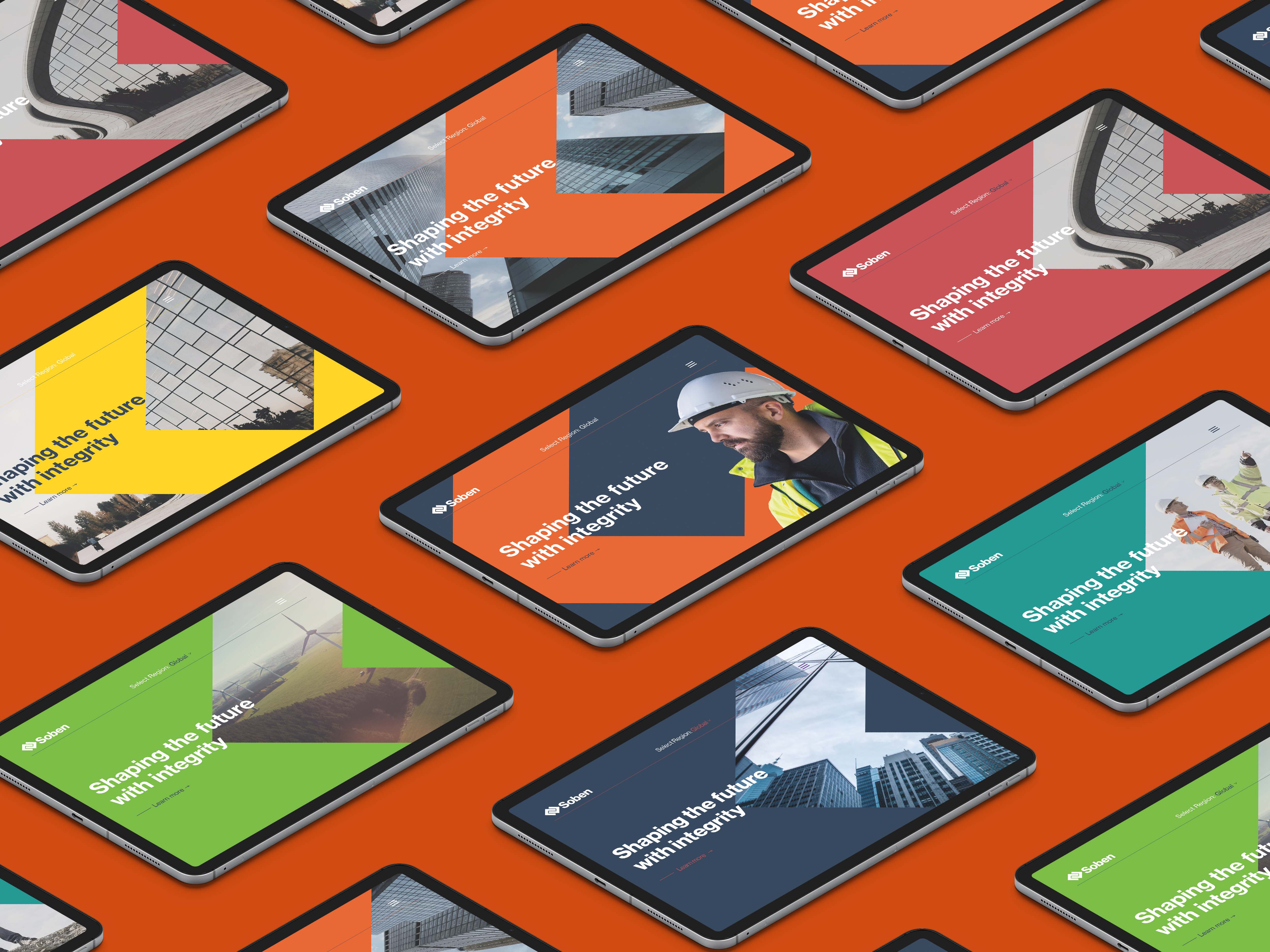 Soben 的新品牌标志设计突出了他们诚实、勇敢、活力、包容的新核心价值观,并引入了新的口号“以诚信塑造未来”。诚信这个词通过透明和道德支持了他们经营方式的几个方面,不从事任何开采自然资源的项目。标语还经过精心设计,以平衡 Soben 的责任精神和目标精神,将强有力的建设信息与建立和加强与真实人物关系的原则相结合。