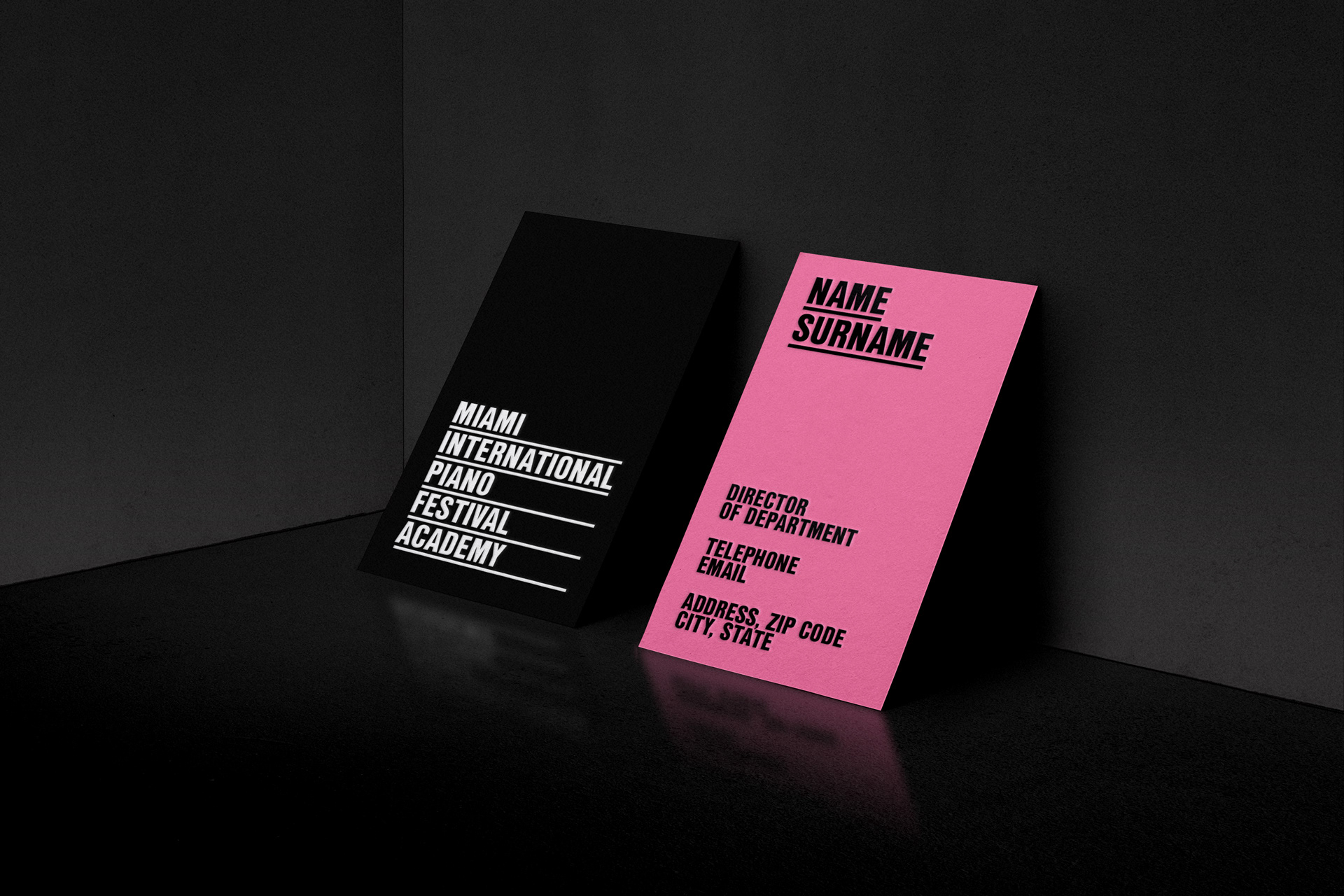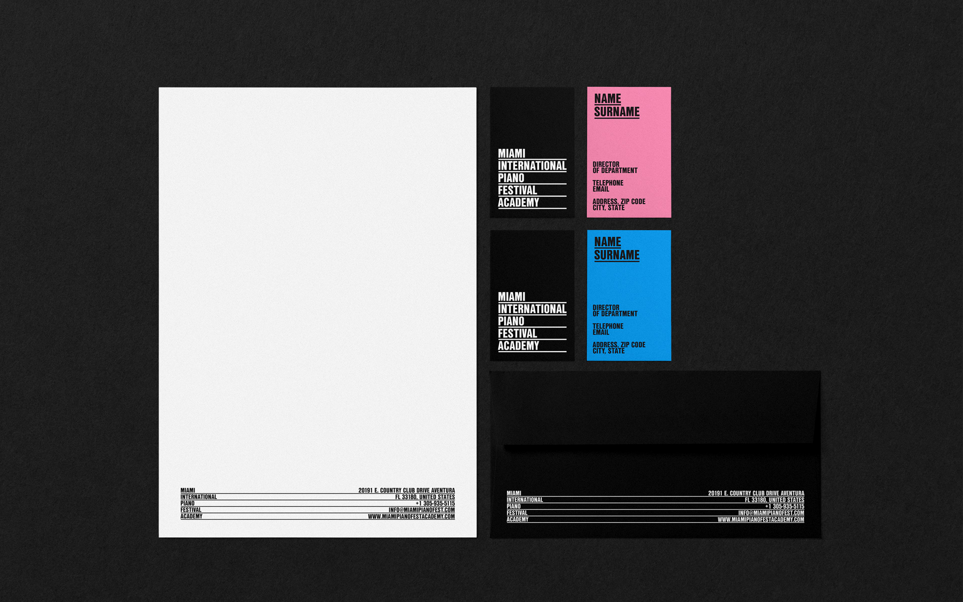 我们使用了典型的音乐元素,五线谱,来强调品牌形象设计名称的每个单词。这些线条沿着图形元素使用,帮助我们创建网格。调色板向迈阿密的标志性艺术建筑致敬。