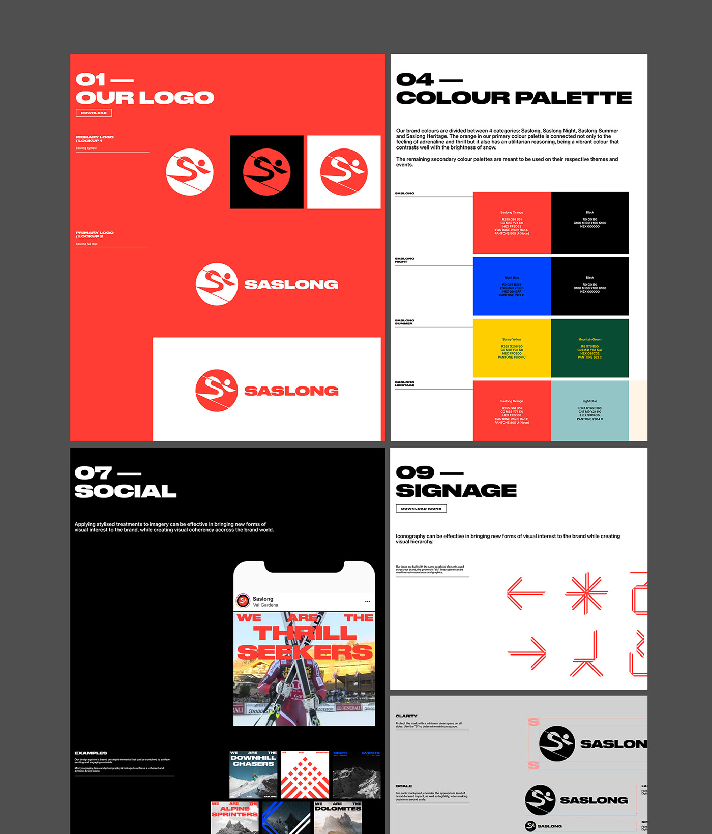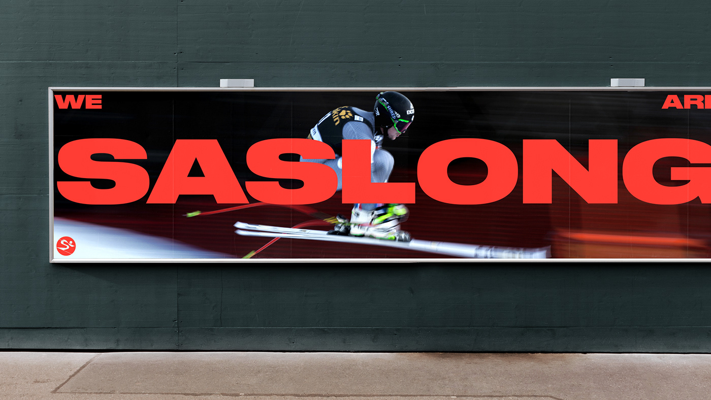 原始标志的传统在新的重新设计的标志中得以保留,设计不仅存在于物理媒体上,也存在于数字屏幕上。品牌语言的灵感来自滑雪者的动作和雪道,以鲜艳的橙色为特色,在明亮的雪地上突显出来。Saslong design system捕捉了滑雪运动中最具标志性的运动之一——障碍滑雪,其特点是滑雪杆之间呈之字形或波浪形,滑雪者在雪地上留下的轨迹产生了动态形状,这些动态形状被完全采纳为品牌形象设计中,用于静态和动态应用中。