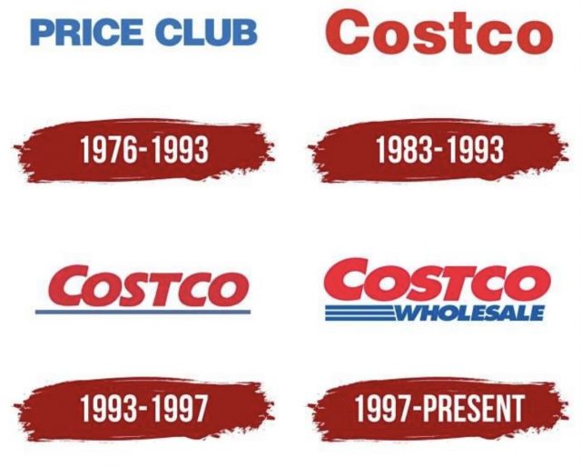Costco的商标包括商店的名称和公司的颜色,以及三条让整个画面充满活力的平行条纹。商标的设计者使用了商业用的Futura Extra Bold斜体字,并把字母略微拉长后,将他们放在了一些稍微倾斜的角度上,向右倾斜。此外,该商标的另一个亮点是它的调色板,它包括红色(#E31837)和蓝色(#005DAA)。标志性的红蓝相间设计,呈现了Costco当前的转折。在此之前,它已经进行了数次革新,但始终秉持着简单文字和简洁装饰的设计理念。初代,也就是1976年的商标非常简单,白色背景上的黑色单词PRICE CLUB;1983年,Costco这个名字开始出现在商标上,为了吸引人们的注意力,设计师在商标上使用了暗红色;当Costco与Price club合并后,商标的字体变成了斜体,字体的颜色变成了淡红色,底部出现了一条水平的蓝色线条;1997年,PriceCostco更名为Costco Wholesale Corporation,并推出了一个新商标,新商标保留了标志性的品牌形象,即红色的字体,增加了一个蓝色的单词“WHOLESALE”和三条水平线。